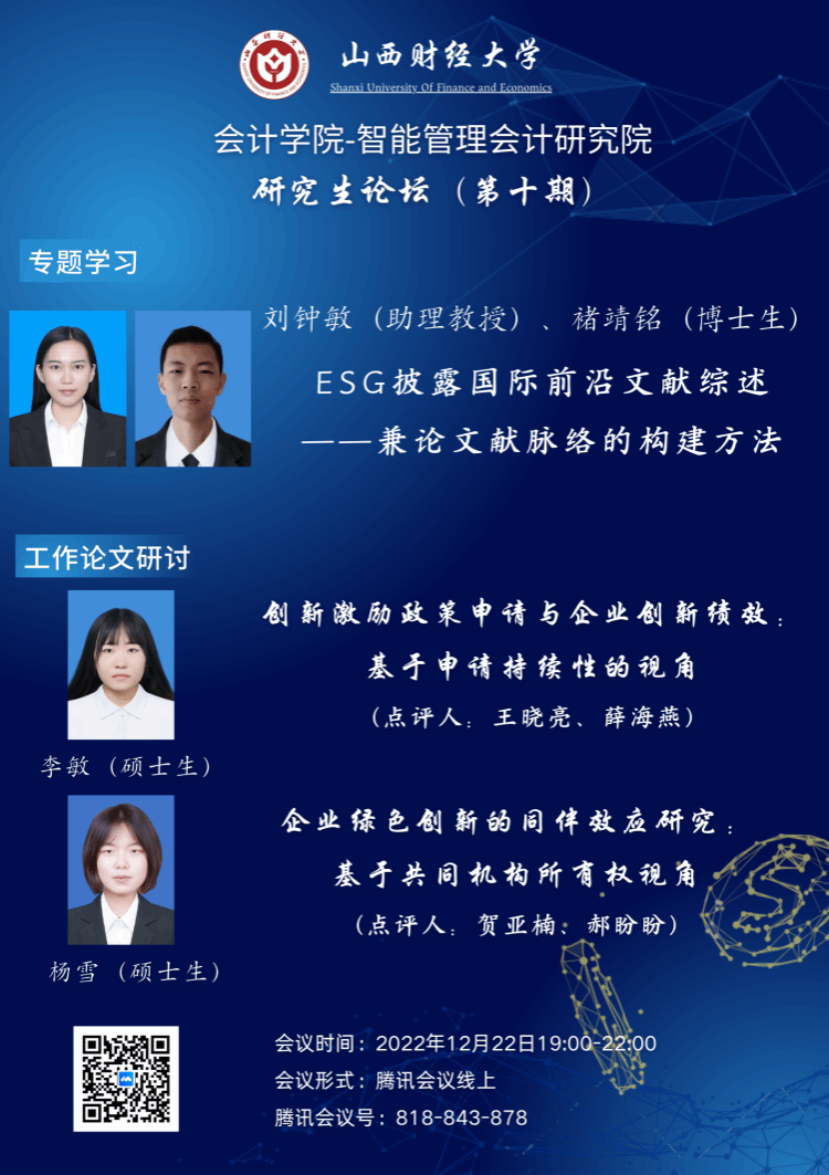 2022年12月22日晚7-10点,由伟德源自英国始于1946伟德bv1946与智能管理会计研究院联合举办的研究生论坛第十期以线上会议的形式举行。会议由李颖老师主持。参会人数八十余人。本次学术沙龙活动主要包括专题学习与工作论文研讨两方面内容。