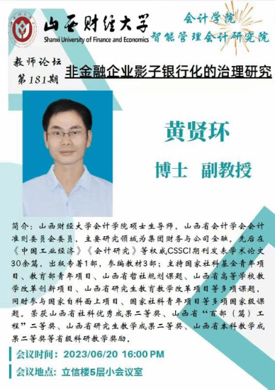 2023年6月20日下午,伟德bv1946与智能管理会计研究院联合举行了第181次教师论坛。本次论坛由智能管理会计研究院副院长李颖教授主持,主要内容为黄贤环老师作主题报告《非金融企业银子银行化的治理研究》。